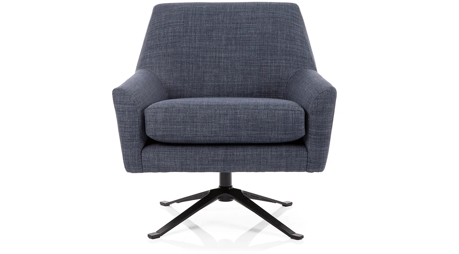 With its contoured back and gracefully sloped arms, the Aria Swivel Chair blends comfort with modernist glamour. A smooth metal swivel base contrasts beautifully with the padded seat, offering both style and versatility. Also available in Leather Style 3097.