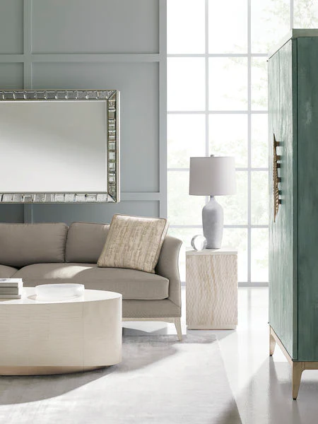 A piece of art is not always found on a canvas. This custom-painted Watercolours cabinet is a piece of art that also solves a variety of functions in your home. Distinguished by its impressionistic Tranquil finish in greyish blue/aqua that has been kissed with silver leaf, it will literally shimmer in any room. In true Caracole style, the custom-designed, asymmetrical, metallic palm frond door pulls enhance this piece of art. Watercolours is sized to hold a 42-inch television. Additional features include a pull-out writing surface with cord access, two adjustable shelves behind sliding doors, as well as, two drawers and two file drawers. Finished with a warm Coastal Silver Leaf plate cap and base, this piece functions as an office, entertainment center or bar with equal fluidity.
