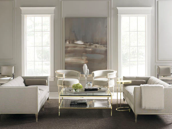 This nearly square cocktail table borrows details, like cut metal grilles, from the best urban architecture. An elongated contemporary honeycomb motif has been cut into metal and suspended between four graceful sabre metal legs – all bathed in highly polished Whisper of Gold. For traditional or contemporary spaces, this ultra-clear glass-topped piece, with a waterfall effect on two ends, lends a sense of architectural elegance to any seating area.