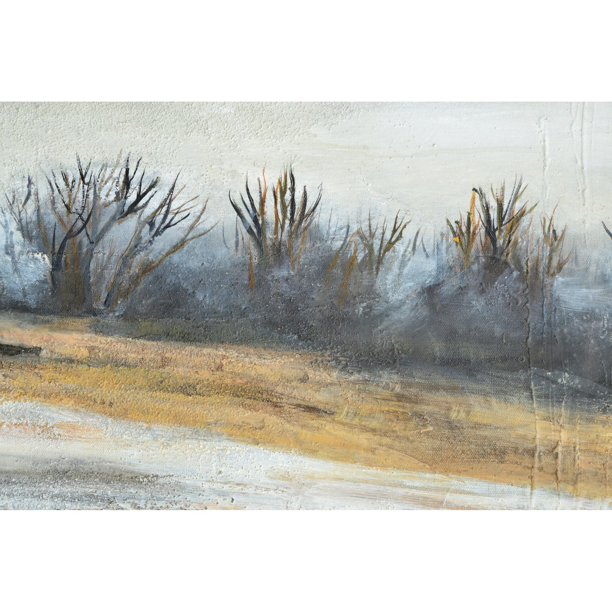 Tranquility reaches every corner of the living space, care of this cotton canvas design. Showcasing the mystical, elegant visual of a forest in the fog, the hand-painted texture brings the look to life. The thin grey frame intensifies the dark focal features of the art.