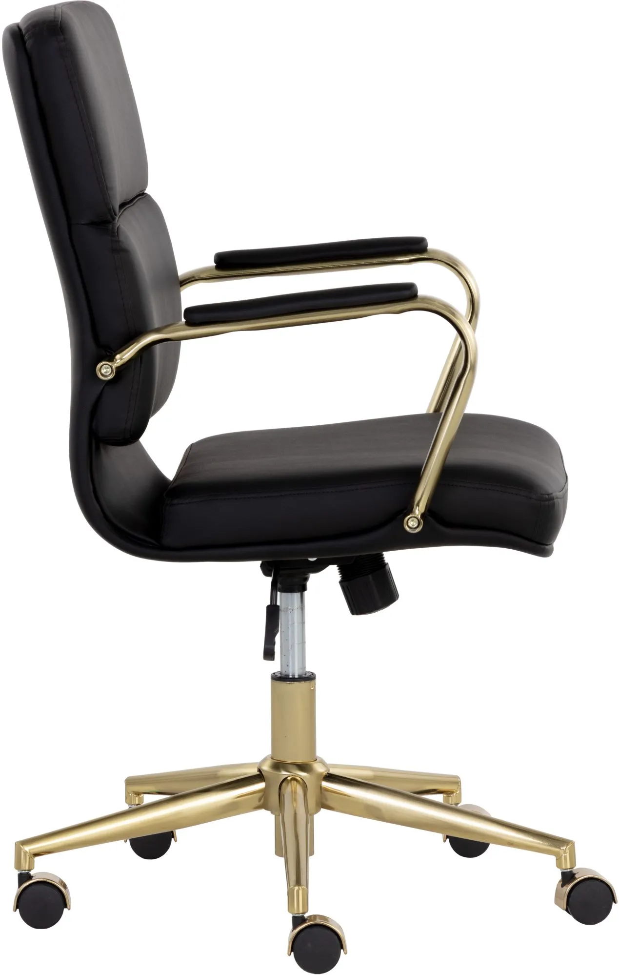 Create a stylish and functional workspace with this stunning modern office chair. Stocked in onyx, snow and tan faux leathers, and features generously padded seating for optimal comfort. Completed with castors for added mobility, and a gold stainless steel frame. Handle With Care: This design has been crafted with faux leather. Faux leather is manufactured to reflect the natural characteristics of leather; as such, colour variations, markings wrinkles, grooves, and light scratches are appreciated characteristics. No two pieces will be alike. Visit our Product Care page for more information on how to ensure the lasting beauty of this piece.