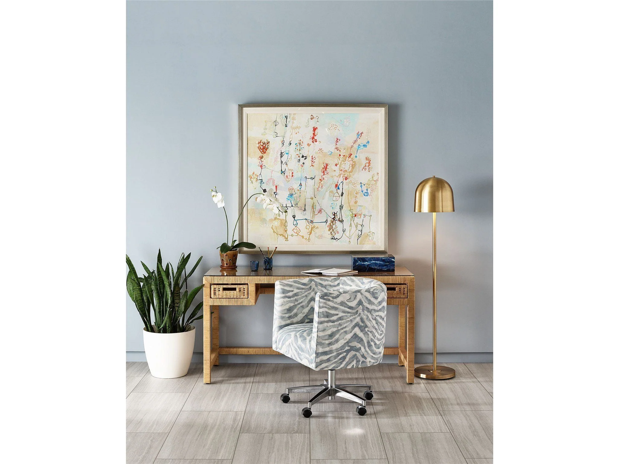 The sensibility of the Lancaster Desk is both breezy and refined, featuring two pull-out drawers encased in a finely woven texture and finished with a smooth glass top.