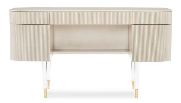 Glamorous storage comes to life in this elegant creation. With a touch of femininity, its graceful design creates a place for everything and somewhere to keep everything in its place. Use it as a desk or dressing table—or both! Its rounded silhouette features fluted detailing highlighted in a lustrous palette of Matte Pearl and touches of Whisper of Gold. This piece is stylish and versatile workstation, with the center drawer offering a drop-down for a keyboard and cord access while the left drawer provides a removable jewelry tray. Look behind each of its two doors and you’ll find generous interior storage, cord access and a center shelf. Lovely acrylic legs capped with Whisper of Gold ferrules complete its fashionable appeal and make it an asset to any well-designed space.