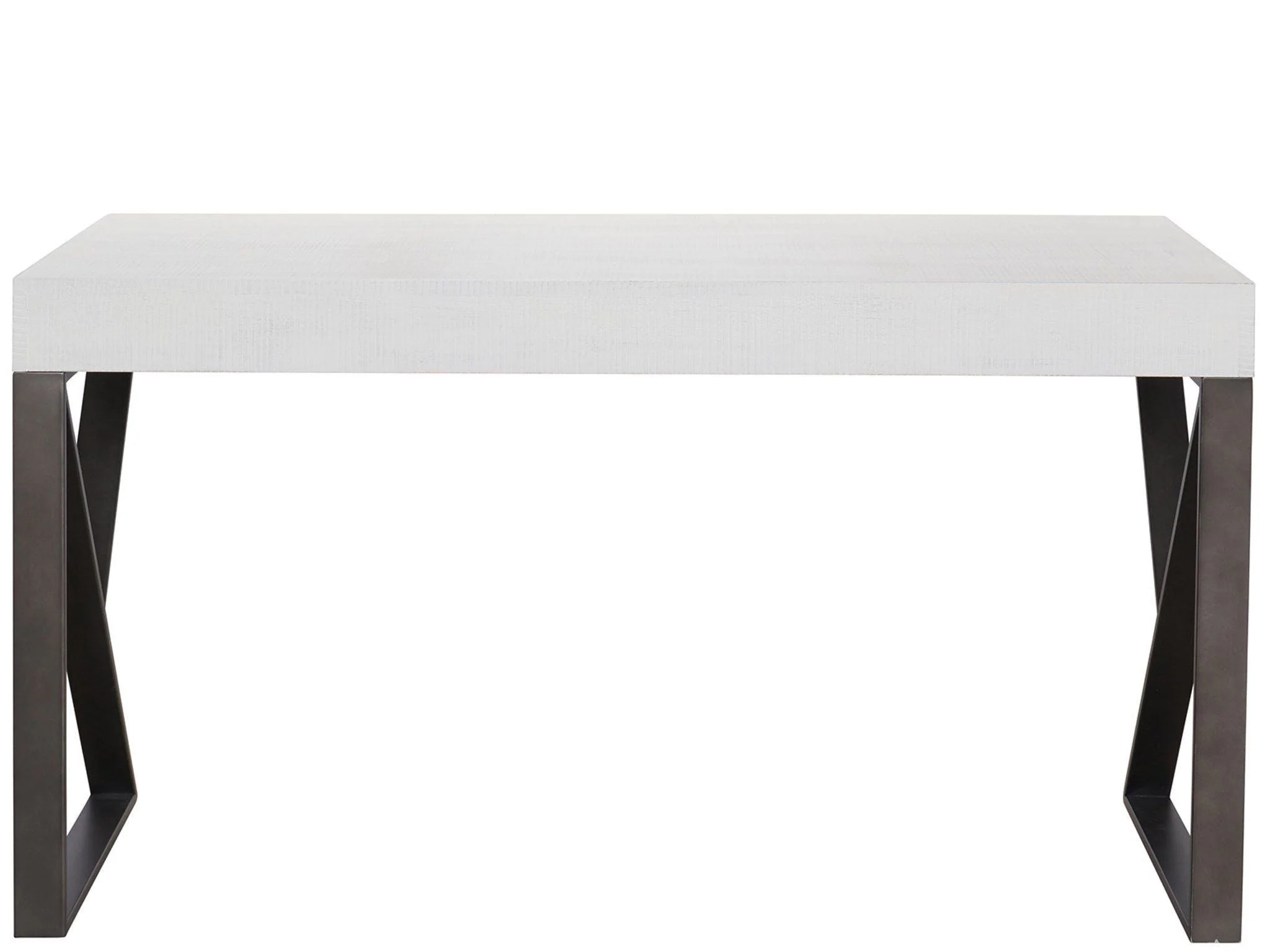 The Ronan Writing Desk is an alluring home office furnishing featuring a geometric silhouette and a contrasting white tabletop and dark metal body.