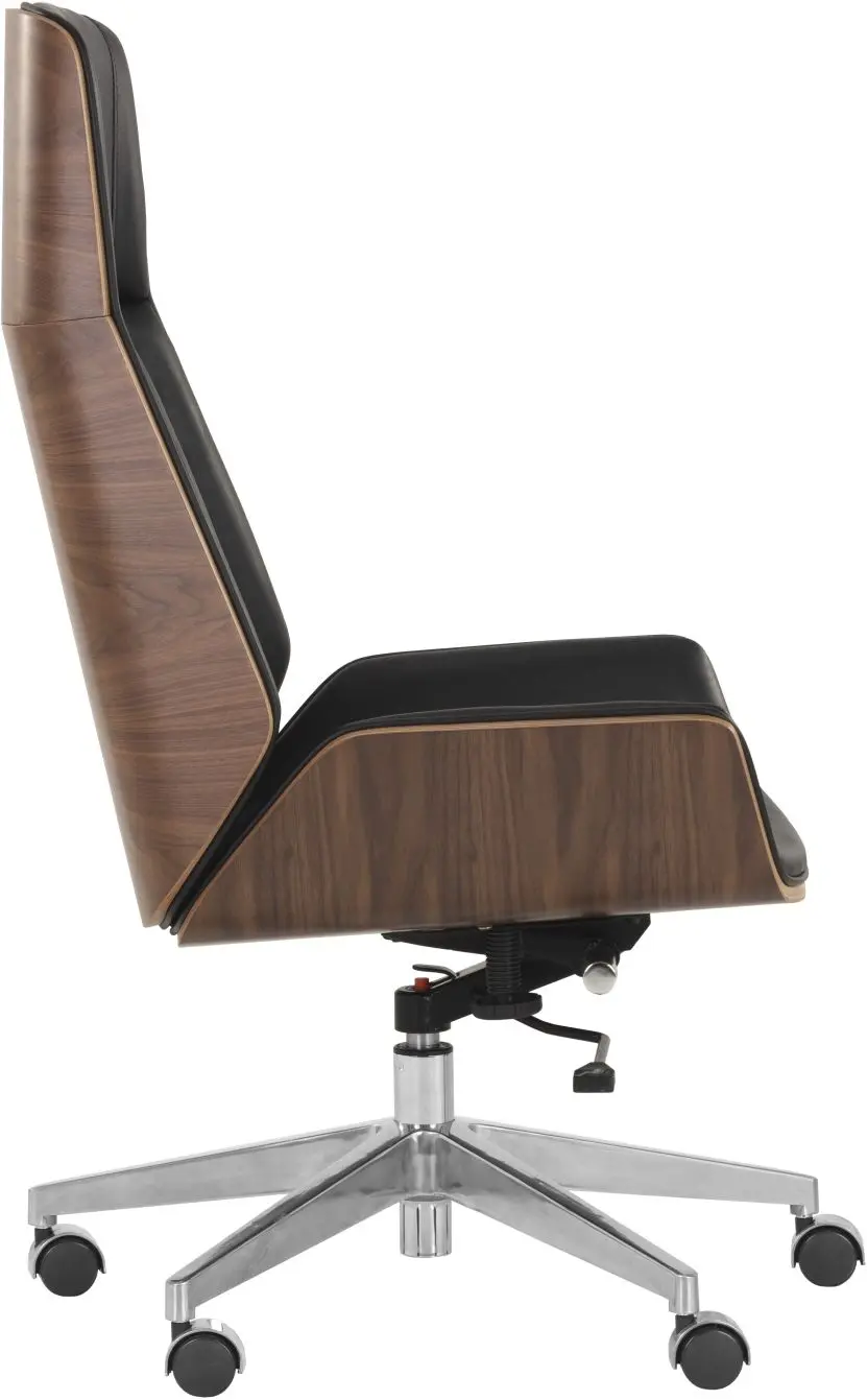 With a grand silhouette that pays homage to mid-century modern designs, this incredible office chair will add luxe comfort to any workspace. Upholstered in dillon black faux leather with an accenting walnut bentwood seat and back. Includes an adjustable seat with added tilt function. Completed with a silver aluminum base and castors. Handle With Care: This design has been crafted with faux leather. Faux leather is manufactured to reflect the natural characteristics of leather; as such, colour variations, markings wrinkles, grooves, and light scratches are appreciated characteristics. No two pieces will be alike. Visit our Product Care page for more information on how to ensure the lasting beauty of this piece.