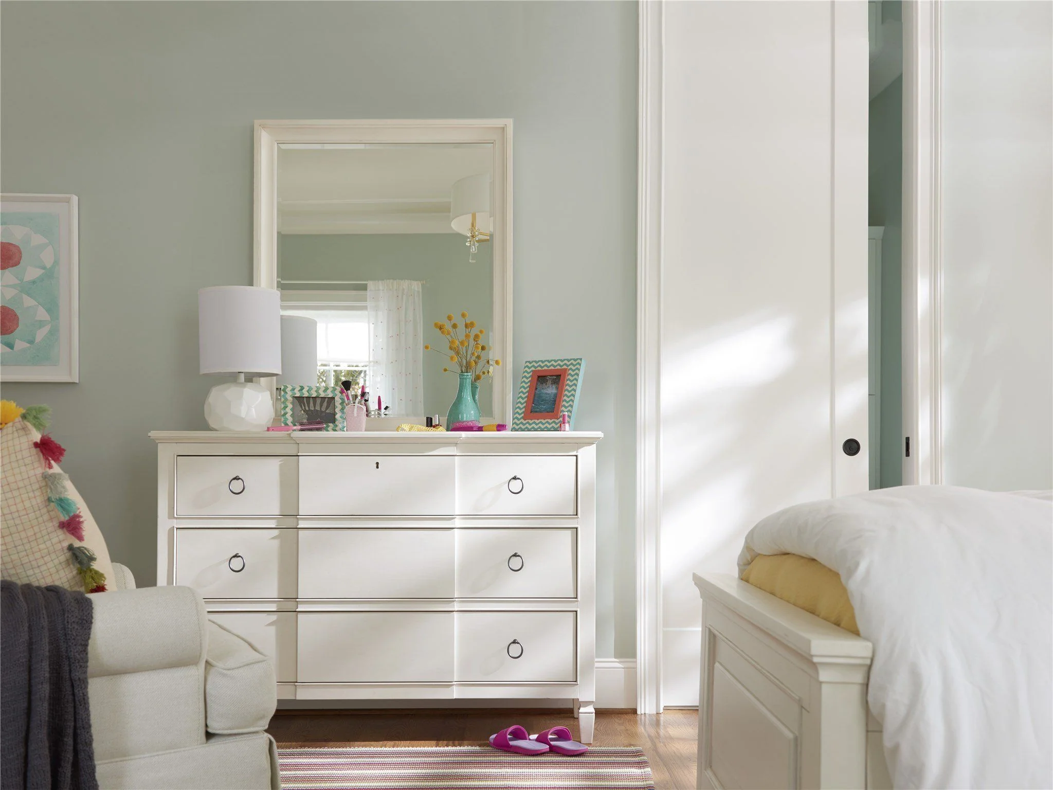 Featuring beveled glass and a clean white finish, the Summer Hill Mirror can be displayed horizontally or vertically.