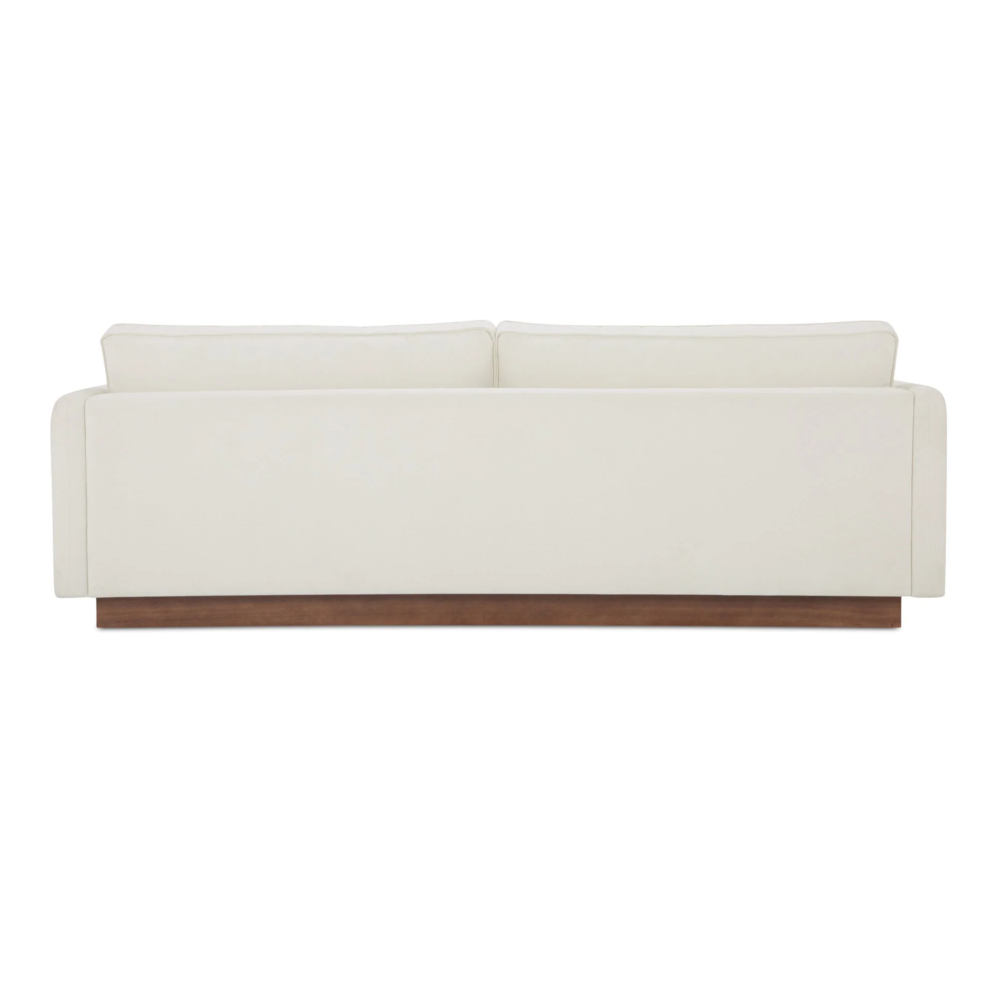 The Vernon sofa blends mid-century design with modern functionality. It features a wooden plinth base for an elevated, lighter appearance. This sectional offers unmatched comfort with removable cushions. Upholstered in durable, OEKO-TEX and Green Guard-certified fabric, it is ideal for family living, combining everyday practicality with durability.